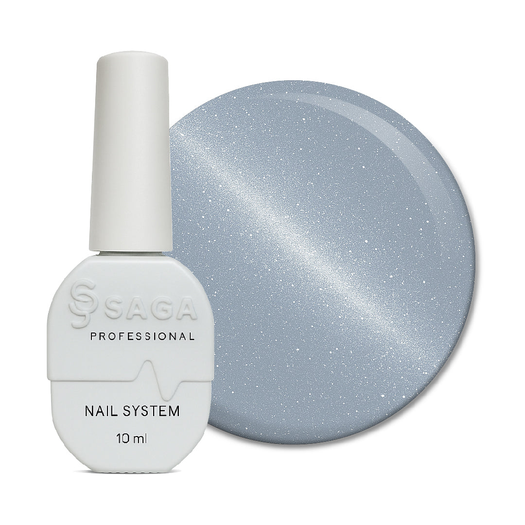 SAGA Professional Glow Cat 8 – ein magnetischer Gel-Lack mit „Katzenauge“-Effekt in einem tiefen graphit-schwarzen Farbton mit leuchtendem violett-rosafarbenem Schimmer. Je nach Lichteinfall und Arbeit mit dem Magneten wandert der Lichtstreifen von einem kühlen Violett zu einem wärmeren rosig-fliederfarbenen Ton, während sich in der Mitte eine leuchtende Neonlinie bildet, die einen ausdrucksstarken, „von innen beleuchteten“ Cat-Eye-Effekt auf den Nägeln erzeugt.