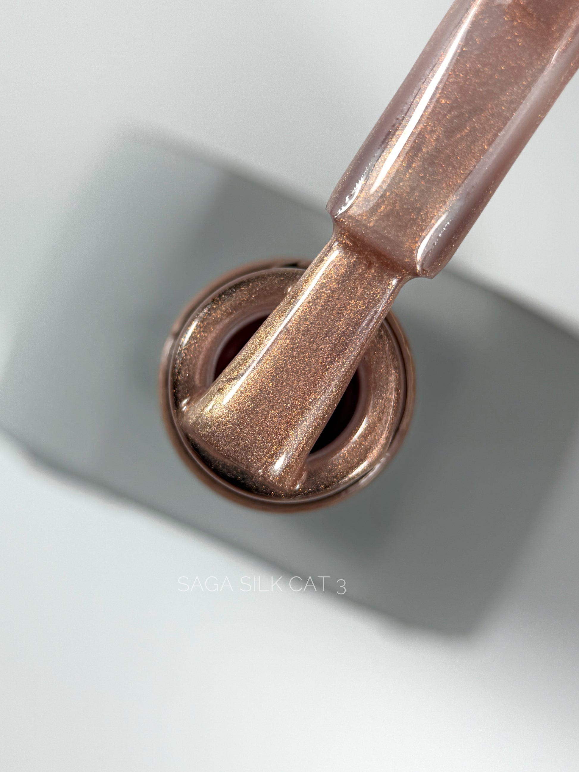SAGA Professional Silk Cat 3 – ein magnetischer Gel-Lack mit „Katzenauge“-Effekt in einem pudrig-rosafarbenen Ton mit kühlem, silbrig-seidigem Schimmer. Beim Arbeiten mit dem Magneten entsteht auf der Oberfläche ein weicher, eleganter Lichtstreifen, der von einem zarten Rosa zu einem kühleren rosa-lila Farbton übergeht und so den Eindruck eines hochwertigen Seidenstoffs auf den Nägeln vermittelt.