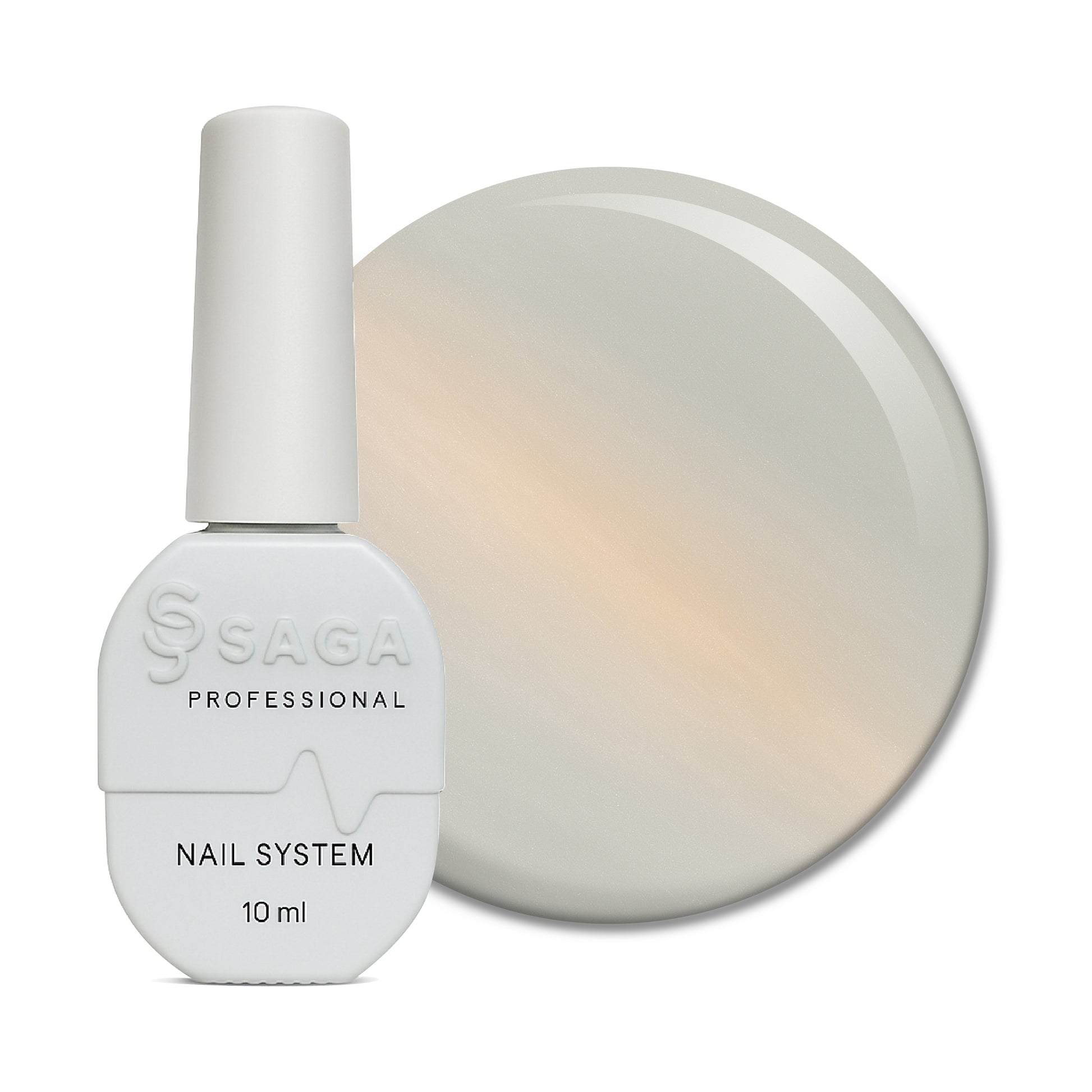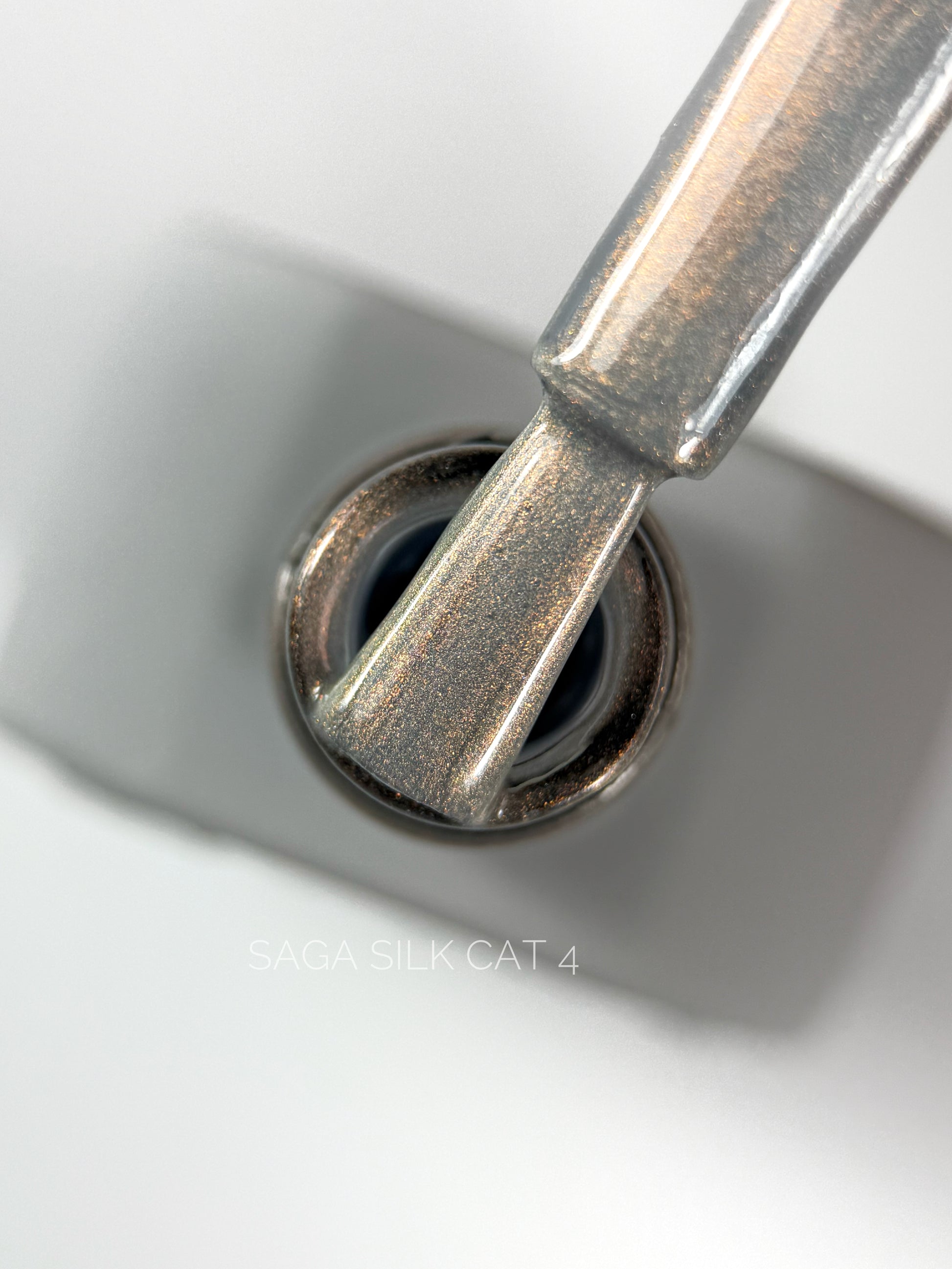 SAGA Professional Silk Cat 4 – ein magnetischer Gel-Lack mit „Katzenauge“-Effekt in einem dezenten beige-nude Farbton mit sanftem Perlmutt-Schimmer in Champagner-Optik. Bei der Arbeit mit dem Magneten entsteht auf der Oberfläche ein zarter, seidig wirkender Lichtstreifen, der von einem warmen Beige zu einem helleren cremig-goldenen Ton übergeht und auf den Nägeln den Effekt eines edlen, fließenden Stoffes erzeugt – sehr gepflegt und elegant.